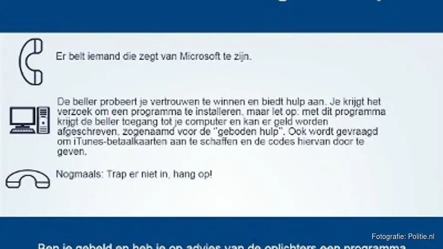 Als u gebeld wordt door iemand die zegt dat hij van Microsoft is, hangt u dan direct op. Als u een telefoonnummer op uw scherm ziet, geeft u dit dan alstublieft aan de politie door. Dit kan telefonisch op 0900 8844 of via een meldformulier. Dit kan de politie helpen bij onderzoek. Als u geen software heeft geïnstalleerd, kan de oplichter niets beginnen. Bent u wel slachtoffer van deze criminelen geworden, neemt u dan zeker contact op met de politie.