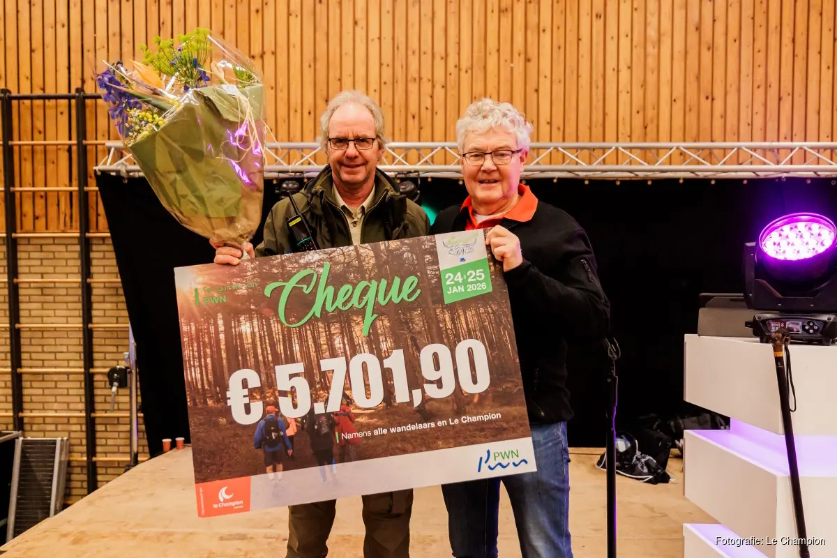 Namens de wandelaars mocht Jan Houtenbos, bestuurslid van Le Champion, zondagmiddag een cheque met het mooie bedrag van € 5.701,90 overhandigen aan Fred van den Bosch van PWN. De vrijwillige donaties worden dit jaar gebruikt voor een project dat in het teken staat van het beschermen en monitoren van de vleermuis.